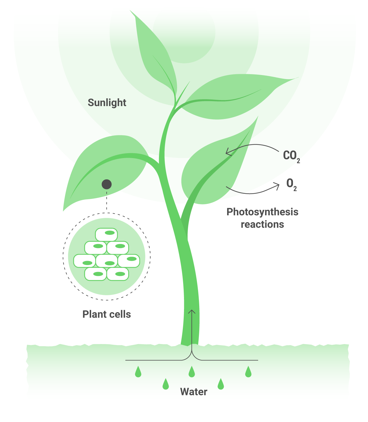 Plants live by using sunlight to trigger a chemical reaction that creates sugars form water and CO2. This process is called photosynthesis and it wouldn’t be possible without chlorophyll, which captures the sunlight, and a collection of proteins and enzymes that use it to break down H2O molecules into hydrogen (protons), electrons and oxygen. The electrons and hydrogen are then used to turn CO2 into carbohydrates, and the oxygen is expelled.